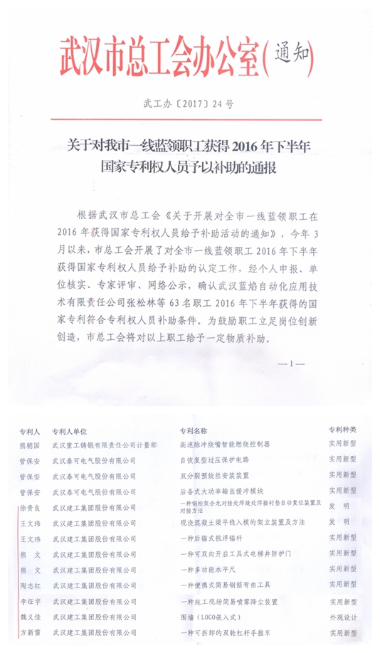 為鼓勵(lì)職工立足崗位創(chuàng)新創(chuàng)造,近日武漢市總工會(huì)對(duì)2016年下半年獲得國(guó)家專利權(quán)的一線職工發(fā)放了專利補(bǔ)助。經(jīng)過個(gè)人申報(bào)、單位核實(shí)、專家評(píng)審、網(wǎng)絡(luò)公示,全市共確認(rèn)了63名具備補(bǔ)助條件的職工,其中武建集團(tuán)的徐貴良、熊文、王文瑋等7位員工取得的《一種鋼桁架合攏對(duì)接處焊縫襯墊自動(dòng)復(fù)位裝置及對(duì)接方法》等9項(xiàng)專利成果入選。
